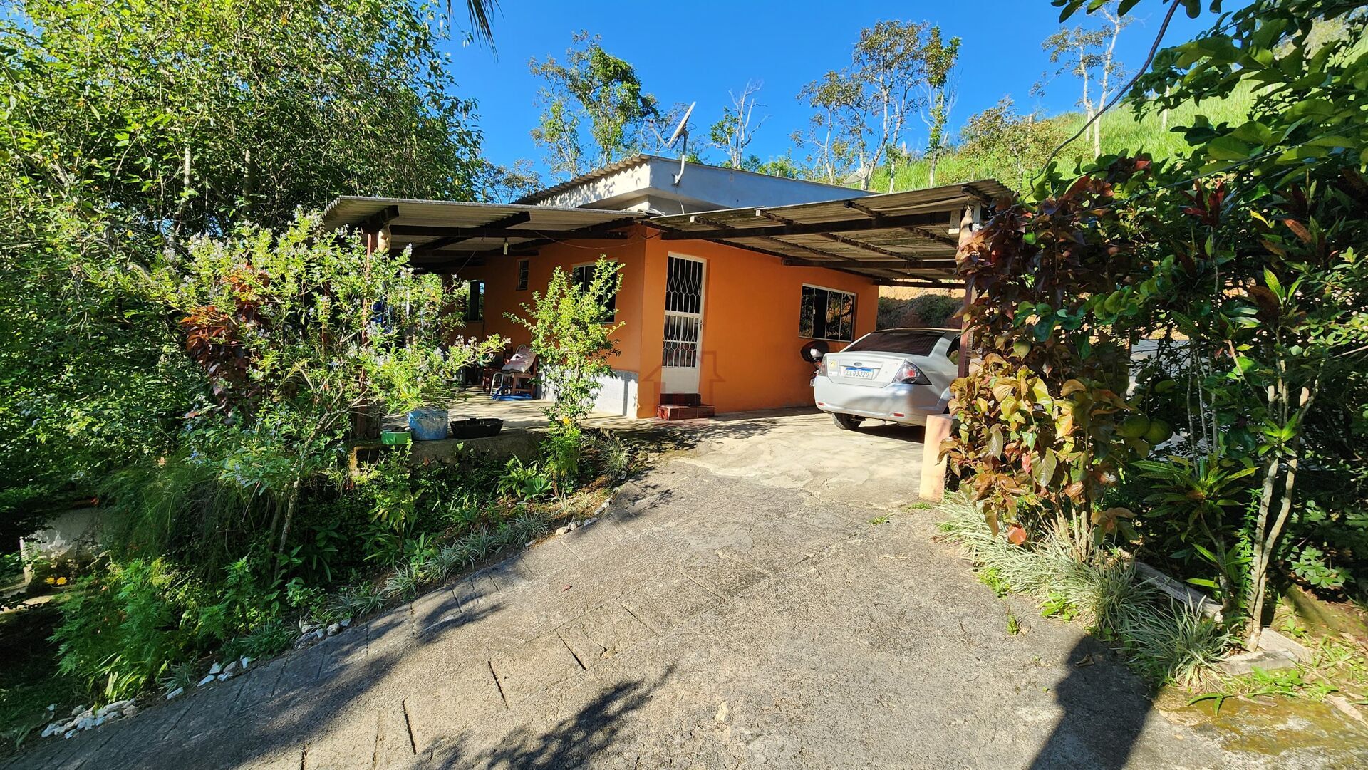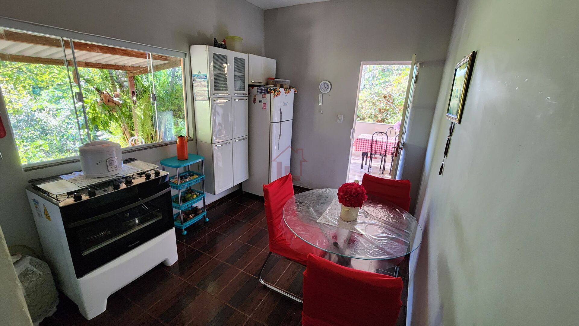 Casa principal com 2 quartos, sala, banheiro social, cozinha, área de serviço, área com churrasqueira e fogão a lenha, garagem, varanda coberta, piscina.